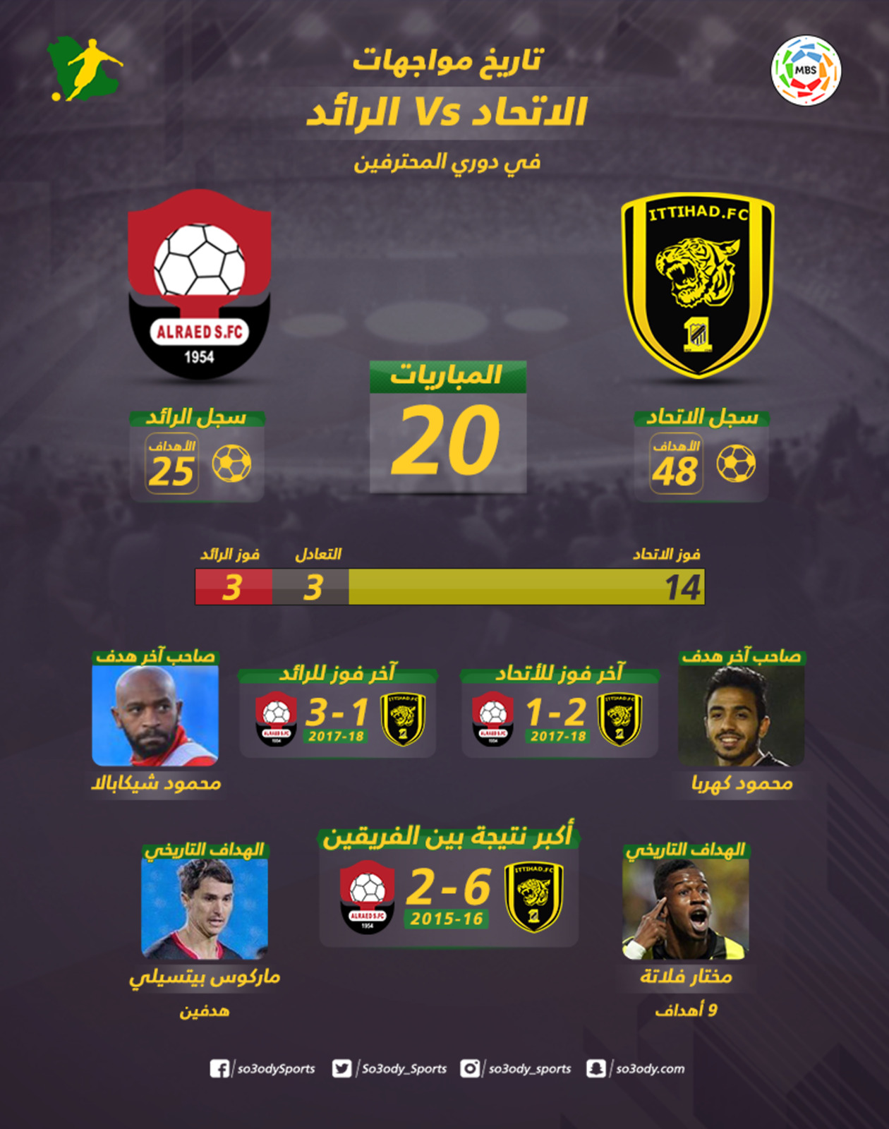 والتقى الفريقان في 20 مباراة سابقة بدوري المحترفين، فاز الاتحاد خلالها في 14 مباراة، مقابل 3 انتصارات للرائد و3 تعادلات بين الفريقين، وسجل الاتحاد 48 هدفًا، بينما استقبلت شباكه 25 هدفًا.