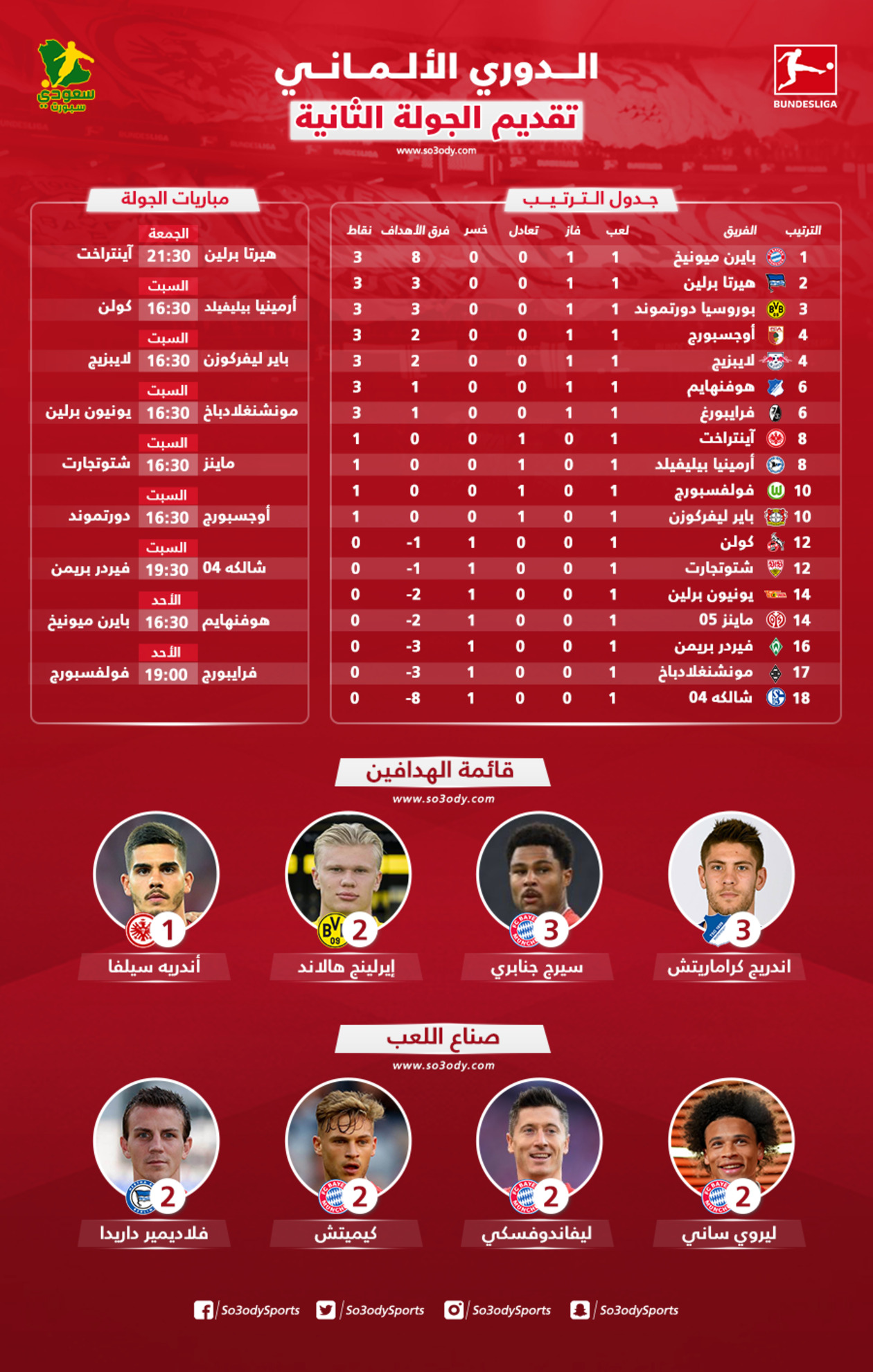 ويتصدر الفريق البافاري جدول الترتيب بفضل فوزه الكاسح على شالكه، متفوقا بفارق الأهداف على 6 فرق حققت الفوز في الجولة الافتتاحية.