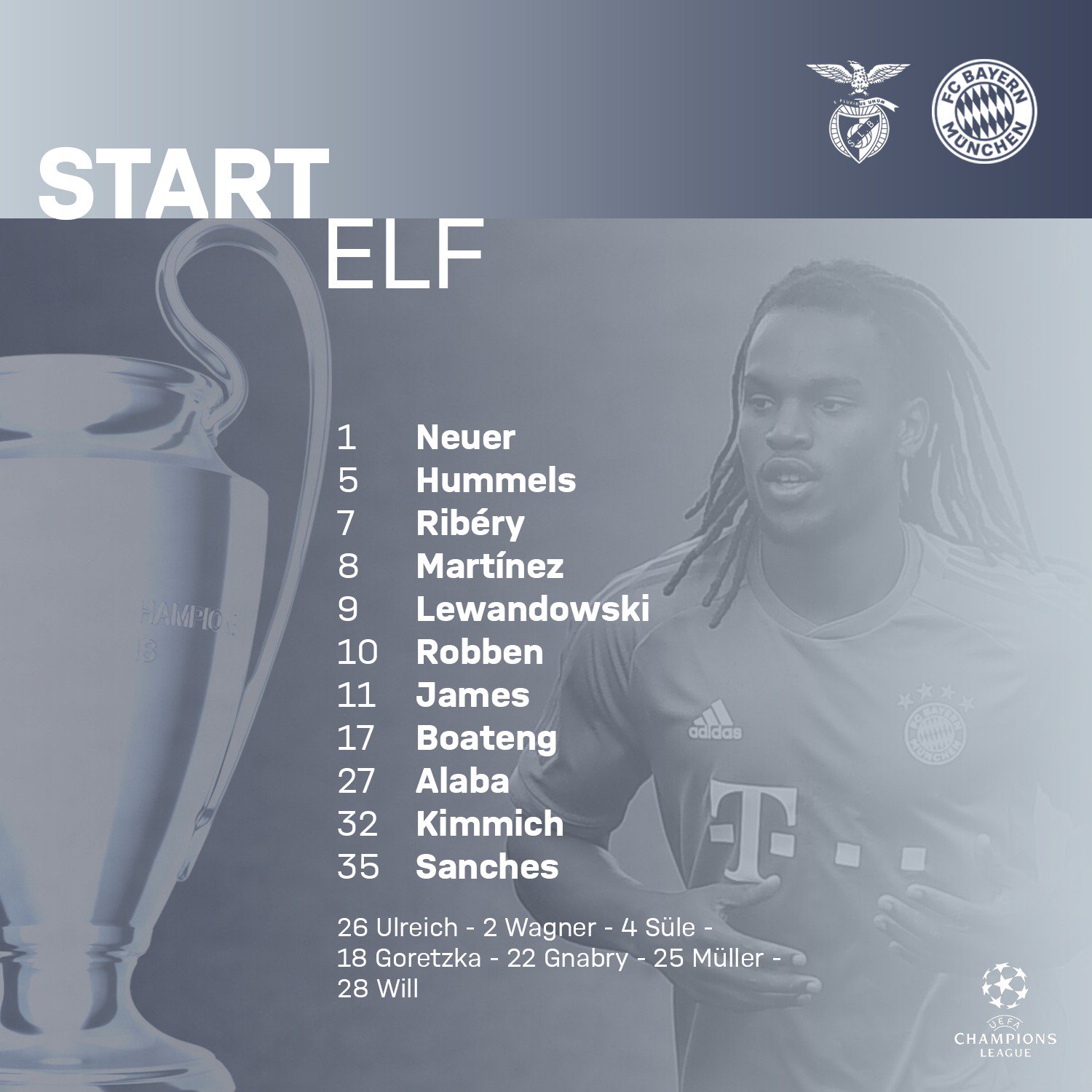 ويضم تشكيل بايرن ميونيخ، كلًا من "نوير، كيميش، بواتينج، هوملز، آلابا، مارتينيز، سانشيز، روبين، خاميس، ريبيري، ليفاندوفسكي".
