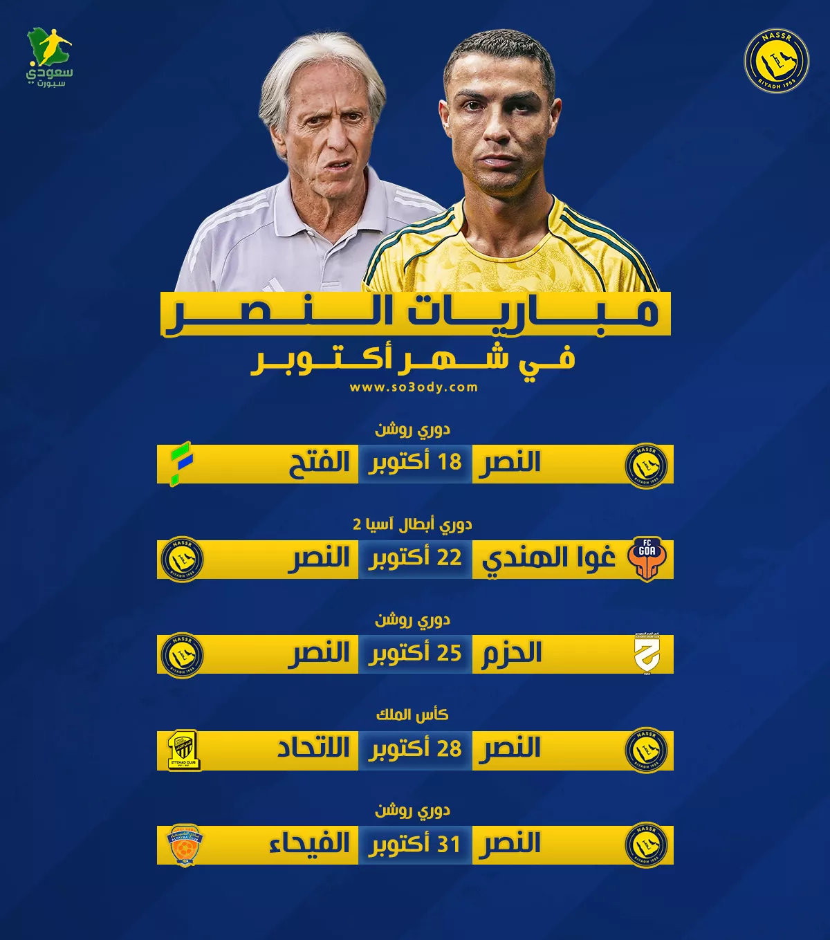 يخوض الفريق الأول لكرة القدم في نادي النصر السعودي، مباريات هامة وقوية خلال شهر أكتوبر 2025، سواء على المستوى المحلي أو القاري.