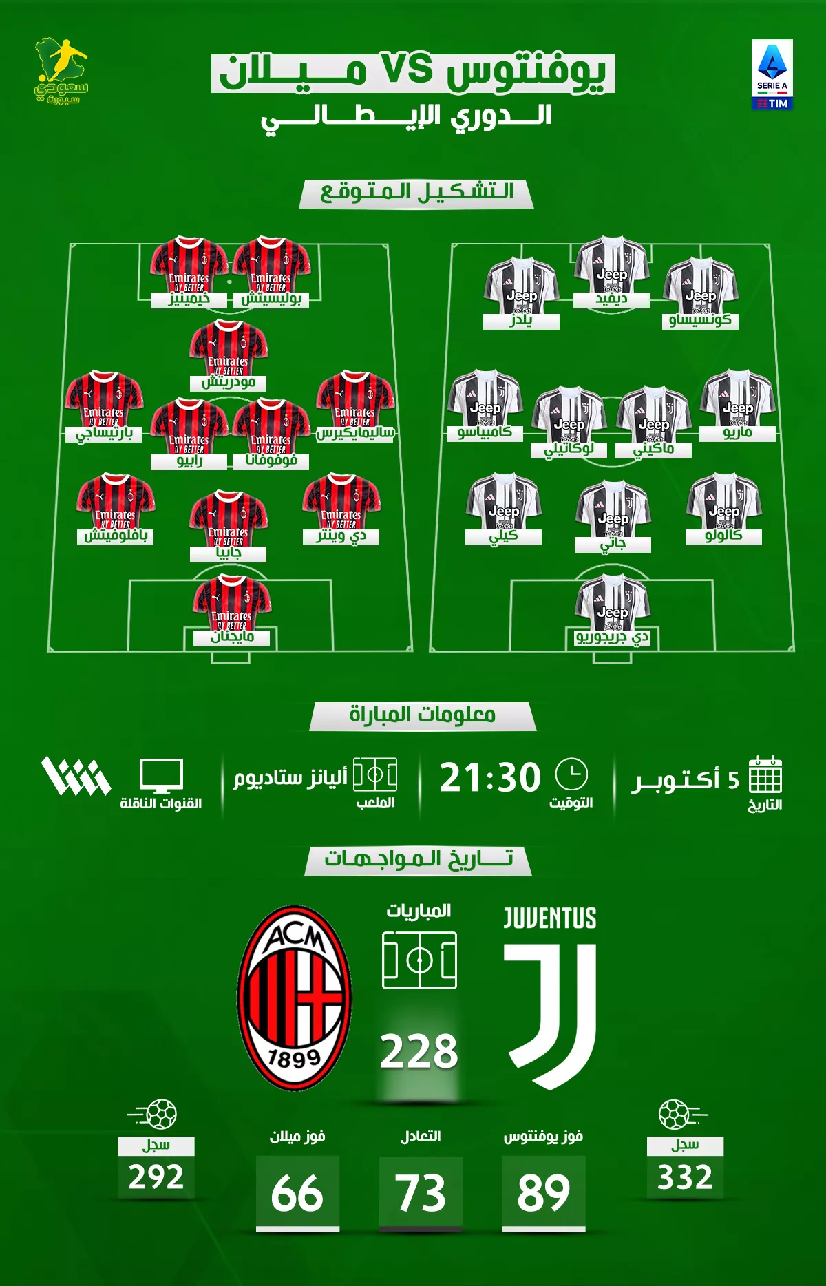 سيلتقي الفريقين في قمة الدوري الإيطالي، حيث سيتم إذاعة اللقاء عبر قناة "شاشا" الكويتية، بكونها أحد القنوات الناقلة لمباريات الكالتشيو.