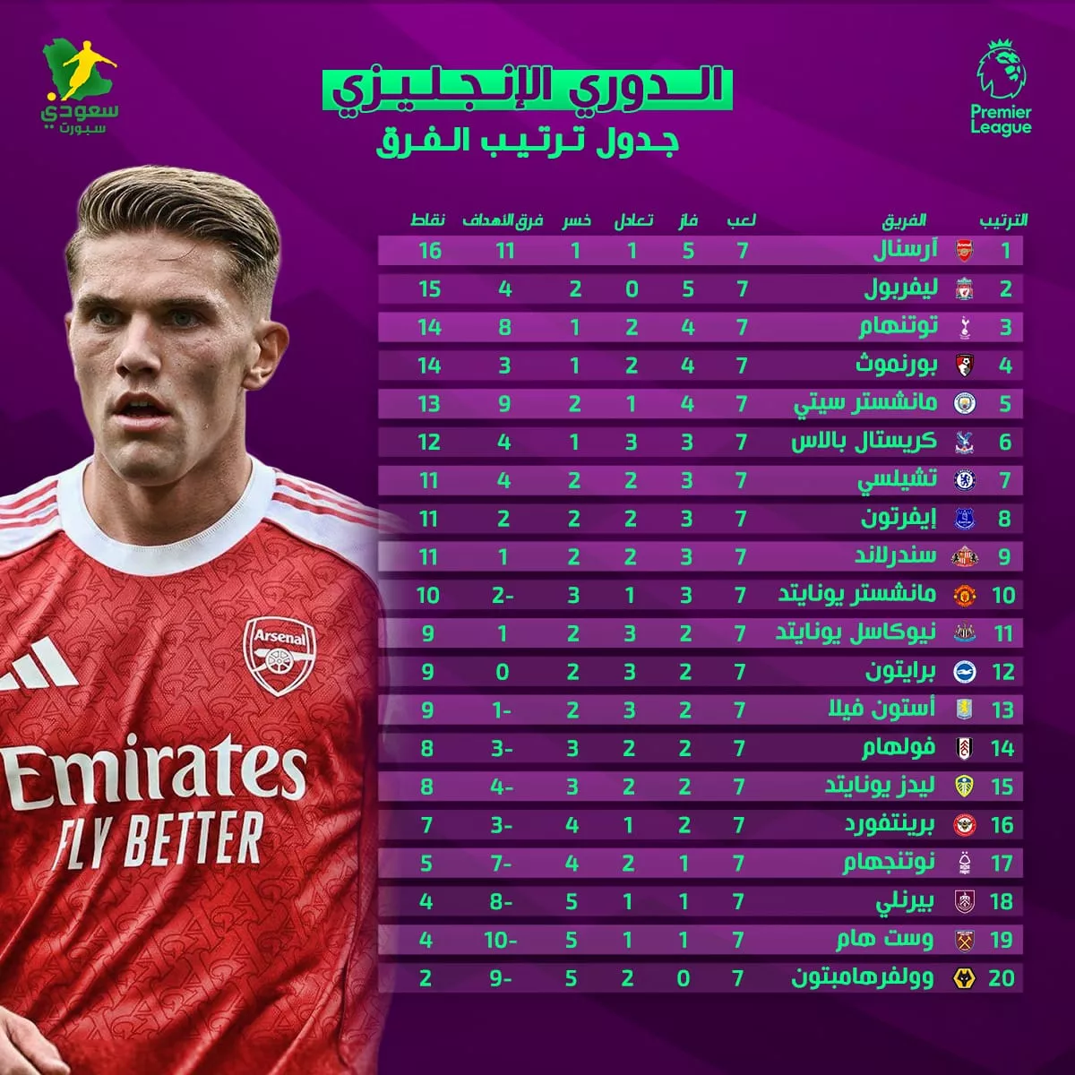 يقدم "سعودي سبورت" ترتيب الدوري الإنجليزي الممتاز عقب الجولة السابعة والذي يتصدره فريق أرسنال بعدما خطف الصدارة من منافسه ليفربول الذى احتل المركز الأول طيلة الأسابيع الماضية .