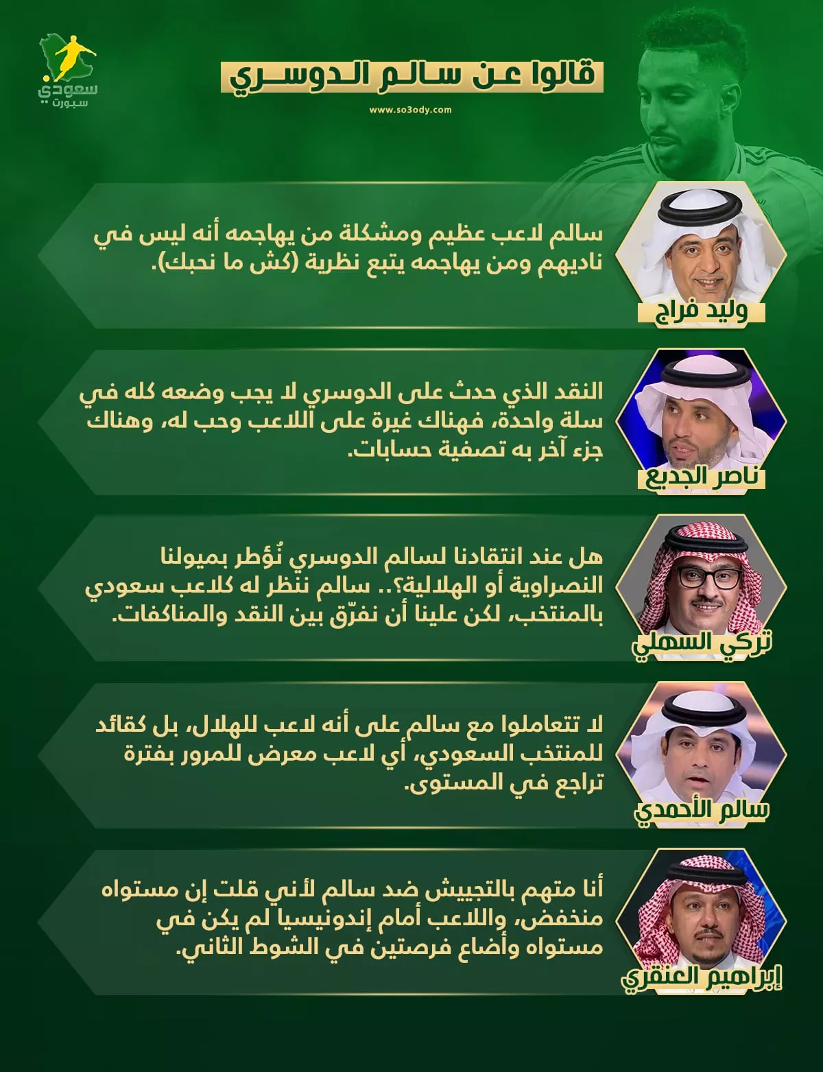 شهدت الساحة الرياضية خلال الساعات الأخيرة العديد من التصريحات على اللاعب سالم الدوسري، قائد المنتخب الوطني الأول، وفريق الهلال، وذلك عقب مباراته الأخيرة مع الأخضر أمام أندونيسيا.