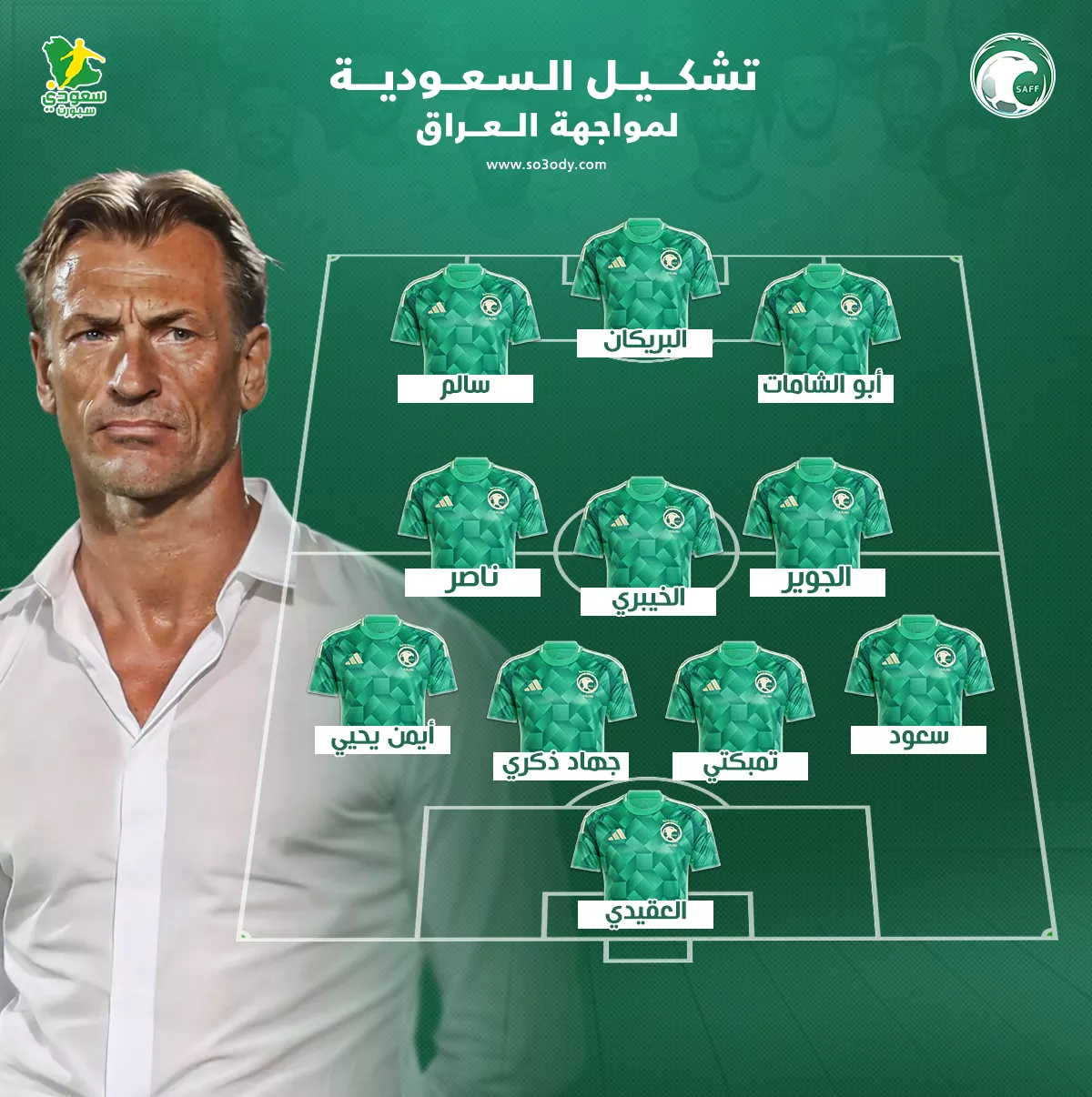 أعلن المدير الفني الفرنسي هيرفي رينارد، عن تشكيل السعودية الرسمي ضد العراق، في مباراة اليوم الثلاثاء 14-10-2025 في الملحق الآسيوي المؤهل إلى كأس العالم 2026.