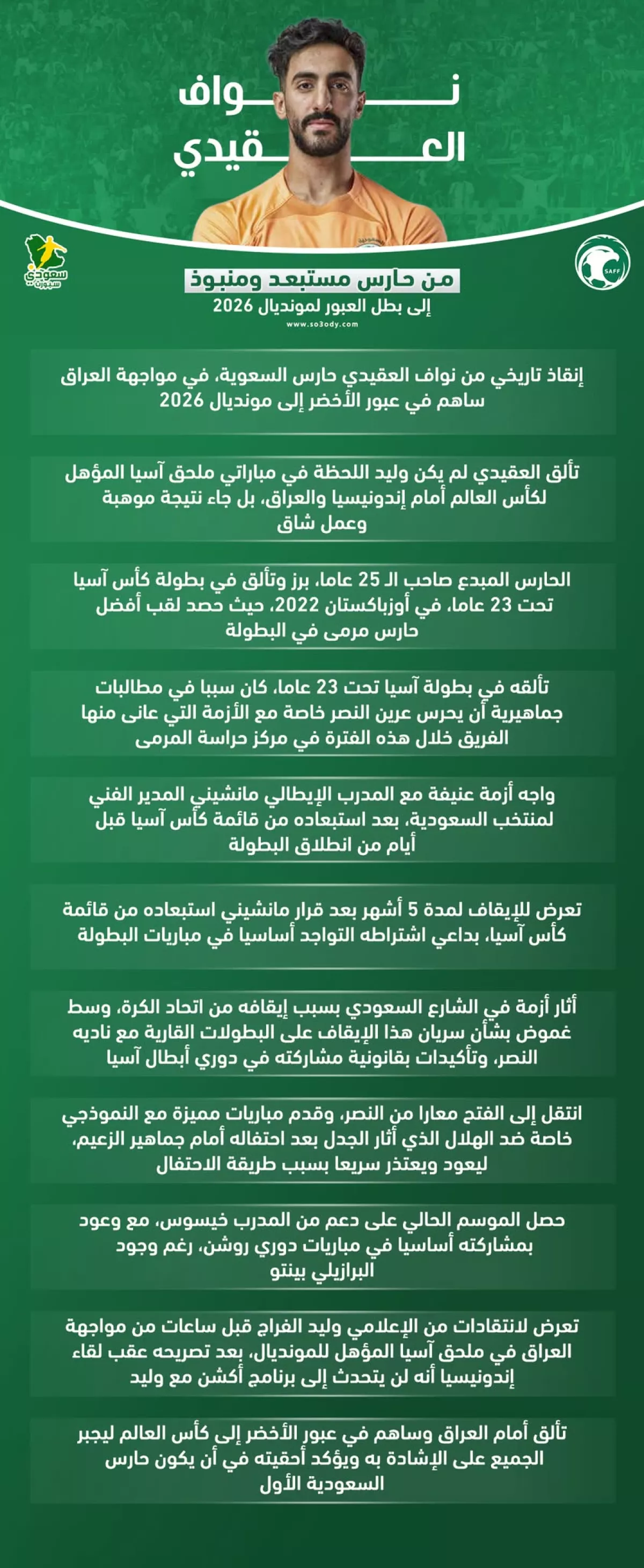 إنقاذ تاريخي من نواف العقيدي حارس السعوية، في مواجهة العراق ساهم في عبور الأخضر إلى مونديال 2026.