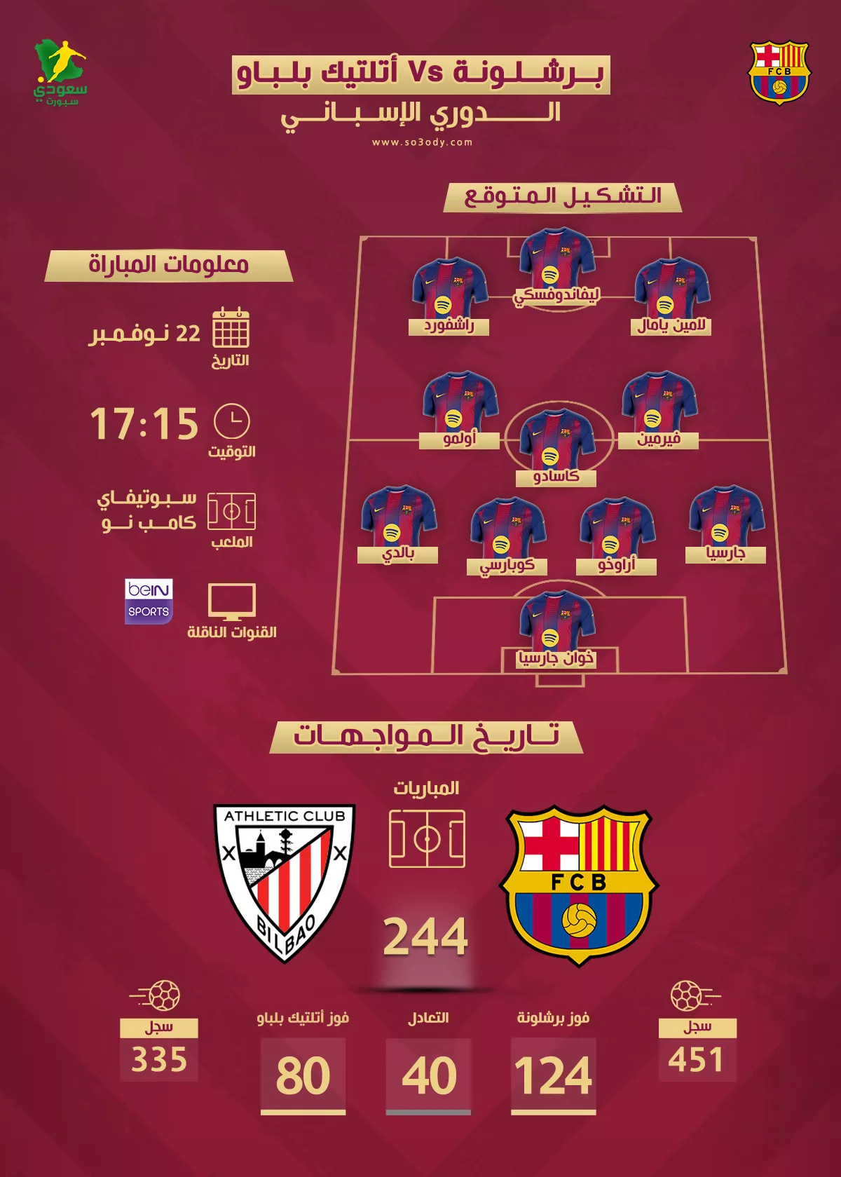 يلتقي اليوم فريق برشلونة، مع نظيره أتلتيك بلباو ضمن لقاءات الجولة الـ13 لبطولة الدوري الإسباني، الليجا.