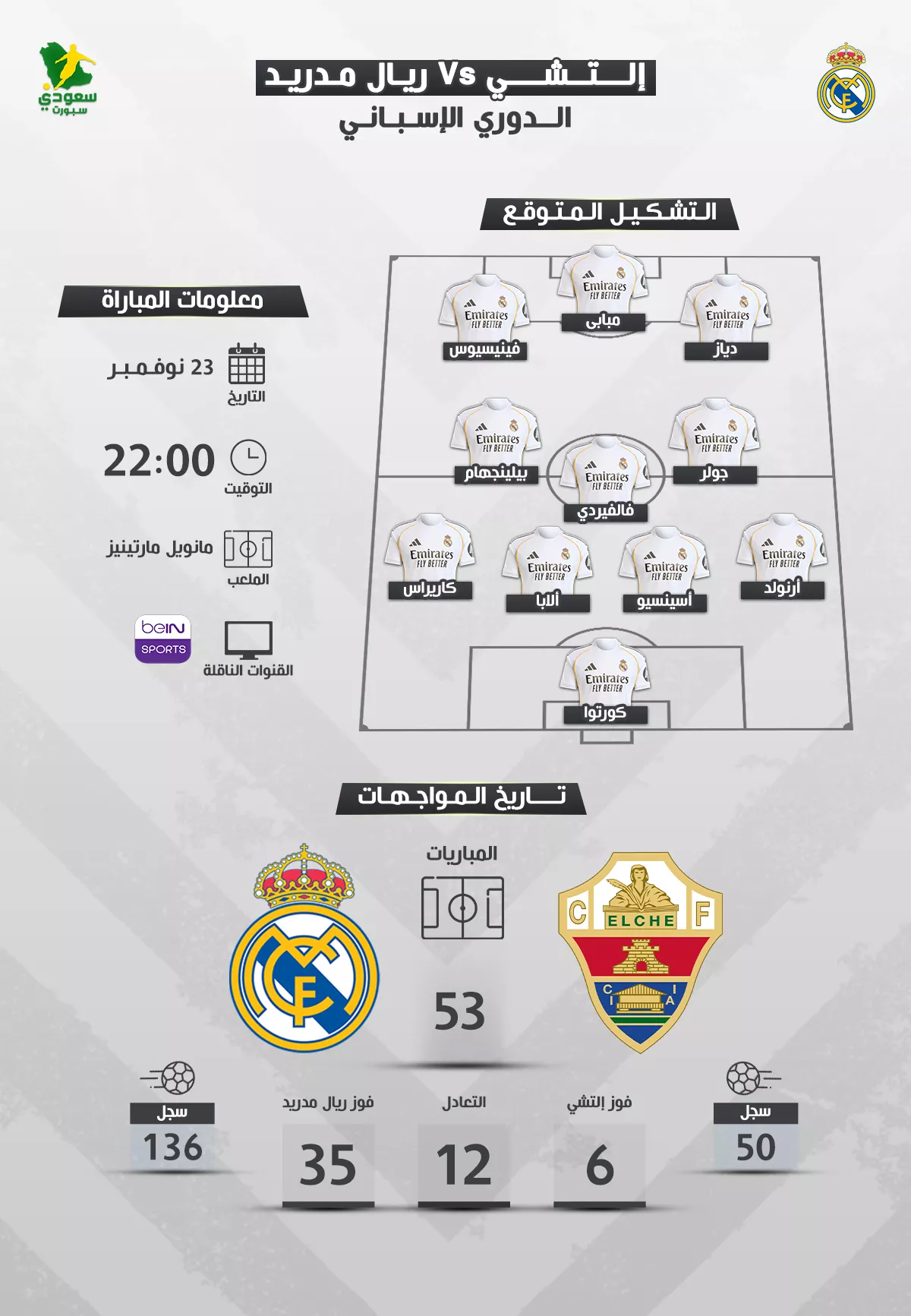 وتنطلق مباراة إلتشي ضد ريال مدريد، في تمام العاشرة مساءً بتوقيت القاهرة، والحادية عشر بتوقيت مكة المكرمة، وتنقل تليفزيونيًا عبر قناة BeIN Sports HD1.