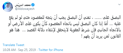 وأضاف:"أمّا إذا كان البصق ليس باتجاه المقصود كأنْ يكون على الأرض أو بالاتجاه الجانبي فإن شرط العقوبة لايتحقق لإنتفاء دلالة القصد … هذا هو القانون لمن يريد أنْ يفهم !".