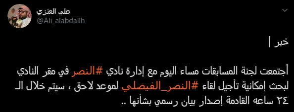 وأشار العنزي في تغريدة عبر صفجته بموقع التدوينات القصيرة "تويتر"، إلى مناقشة الاجتماع، طلب النصر، بتأجيل لقاء الفريق الأول لكرة القدم مع الفيصلي، ضمن منافسات الجولة السادسة من مسابقة دوري كأس الأمير محمد بن سلمان للمحترفين.