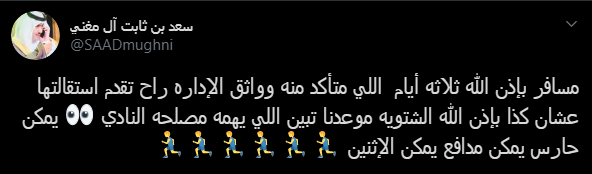 ومن ناحيته، أكد سعد بن ثابت آل مغني، عضو الشرف الذهبي بنادي النصر، على استقالة إدارة صفوان السويكت، قبل شهر يناير القادم.