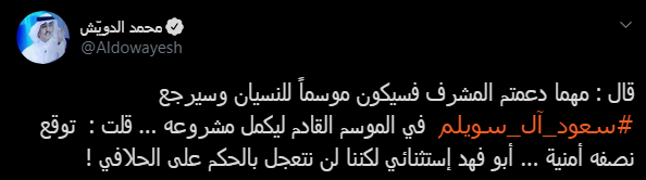 وكتب الناقد الرياضي: "قال: مهما دعمتم المشرف فسيكون موسمًا للنسيان وسيرجع سعود آل سويلم في الموسم القادم، ليكمل مشروعه.. قلت: توقع نصفه أمنية.. أبو فهد استثنائي لكننا لن نتعجل بالحكم على الحلافي!".
