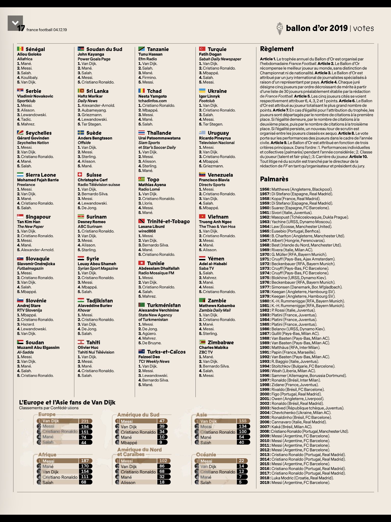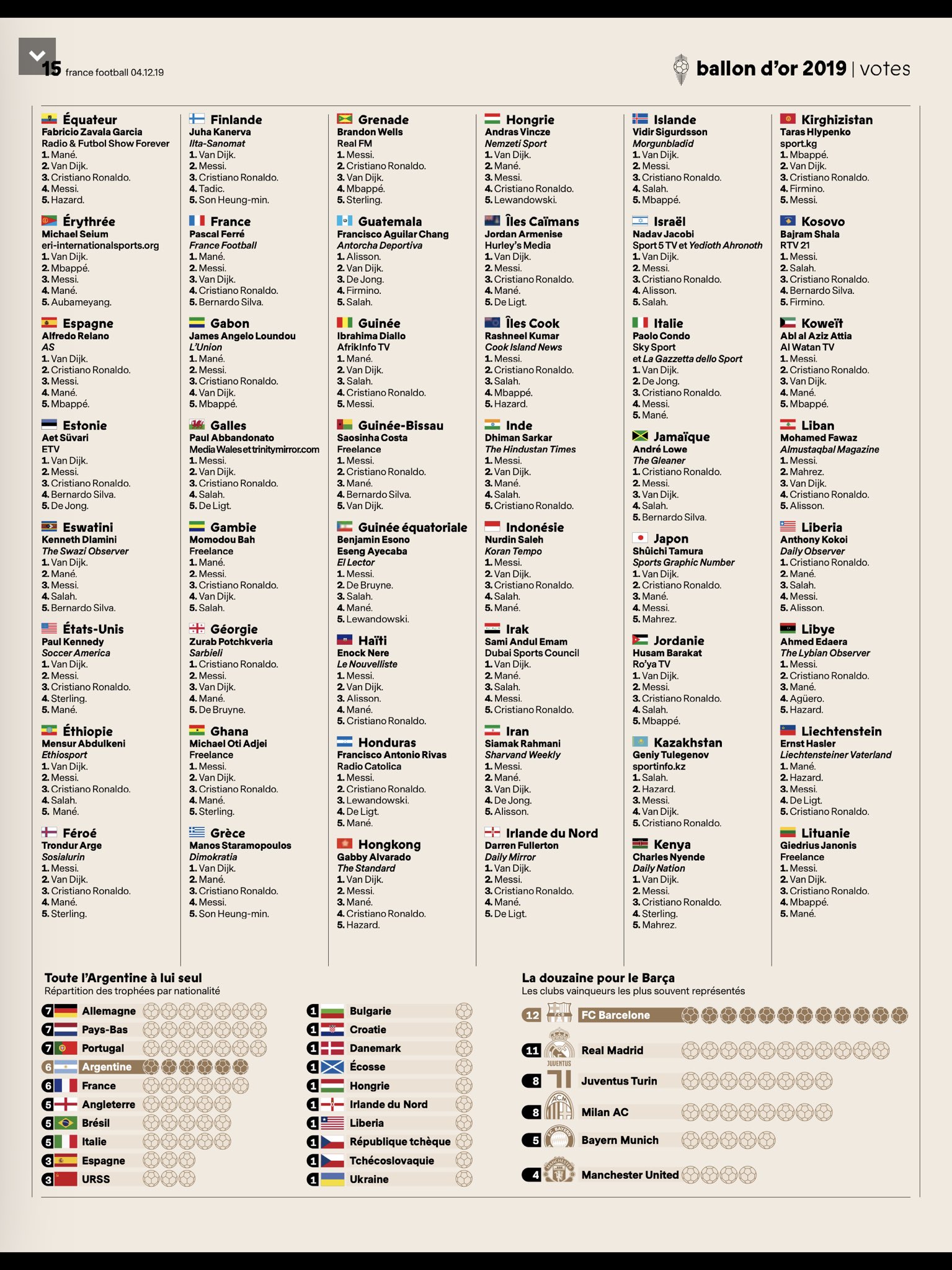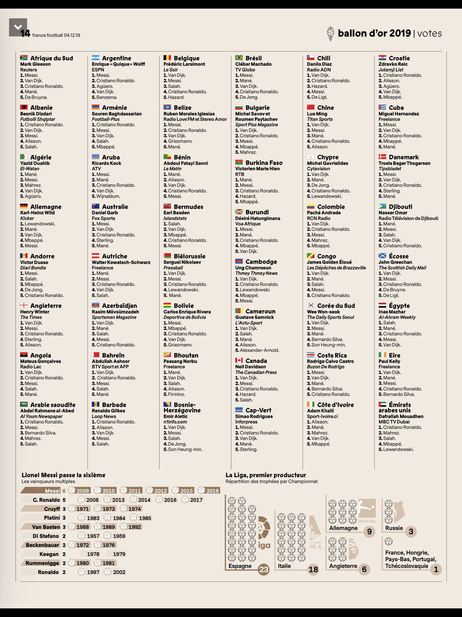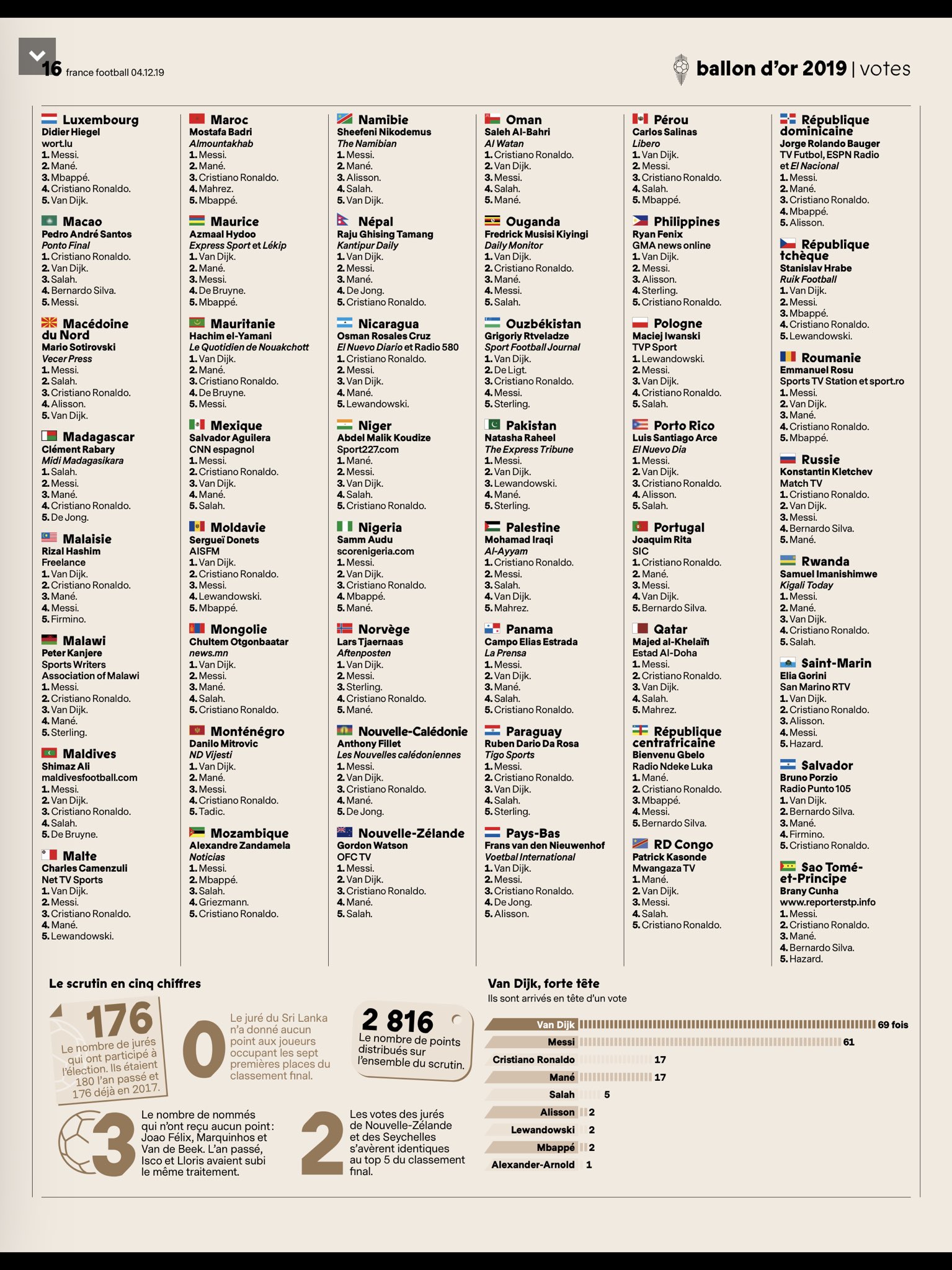 نشرت مجلة "فرانس فوتبول" الفرنسية نتائج تصويت الصحفيين حول العالم بشكل مفصل.