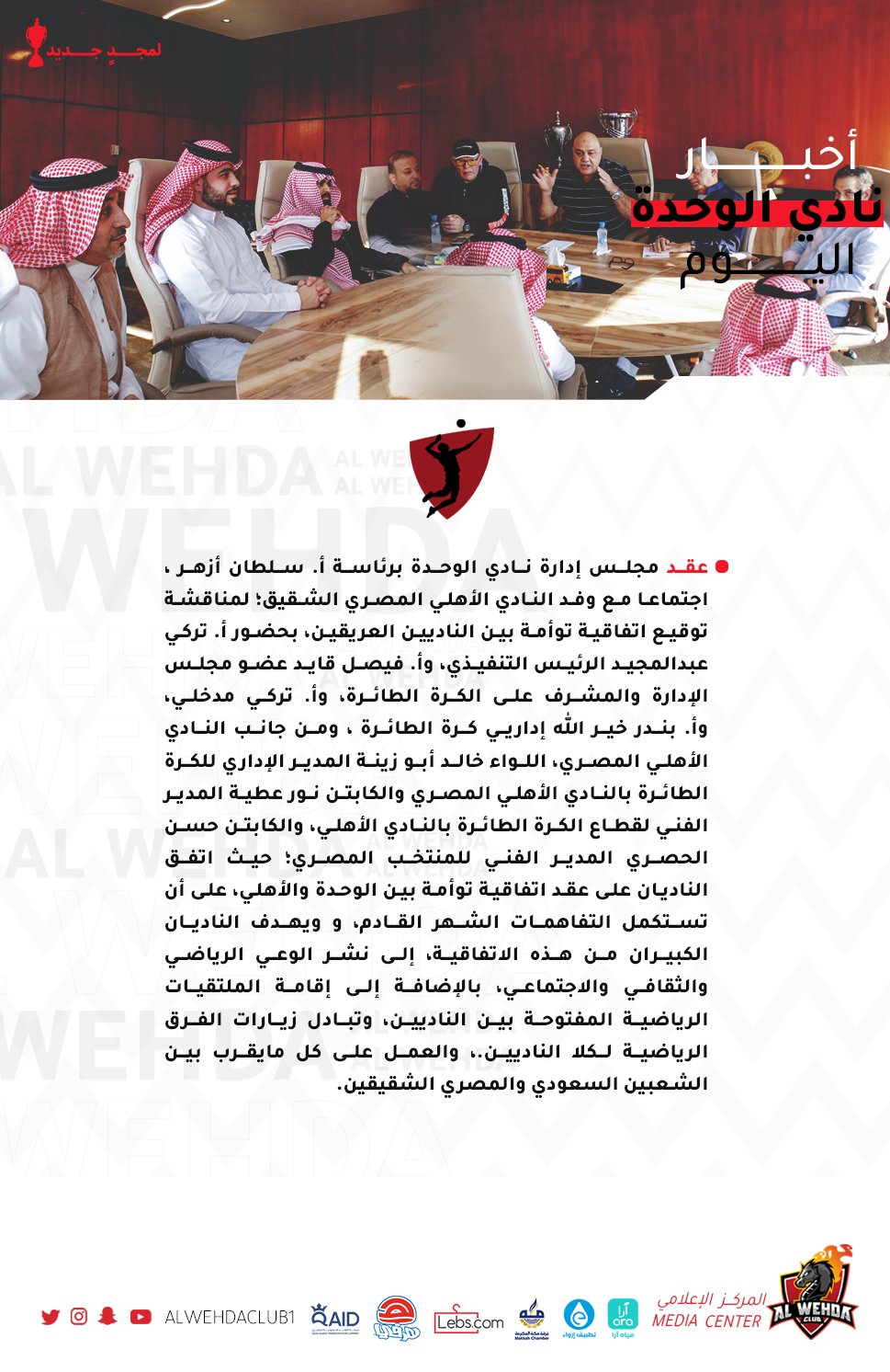 "عقد مجلس إدارة نادي الوحدة، برئاسة أ. سلطان أزهر، اجتماعًا مع وفد النادي الأهلي الشقيق؛ لمناقشة توقيع اتفاقية توأمة بين الناديين العريقين، بحضور أ.تركي عبد المجيد الرئيس التنفيذي، وأ. فيصل قايد عضو مجلس الإدارة والمشرف على الكرة الطائرة، وأ. تركي مدخلي، وأ. بندر خير الله إداريي كرة الطائرة.