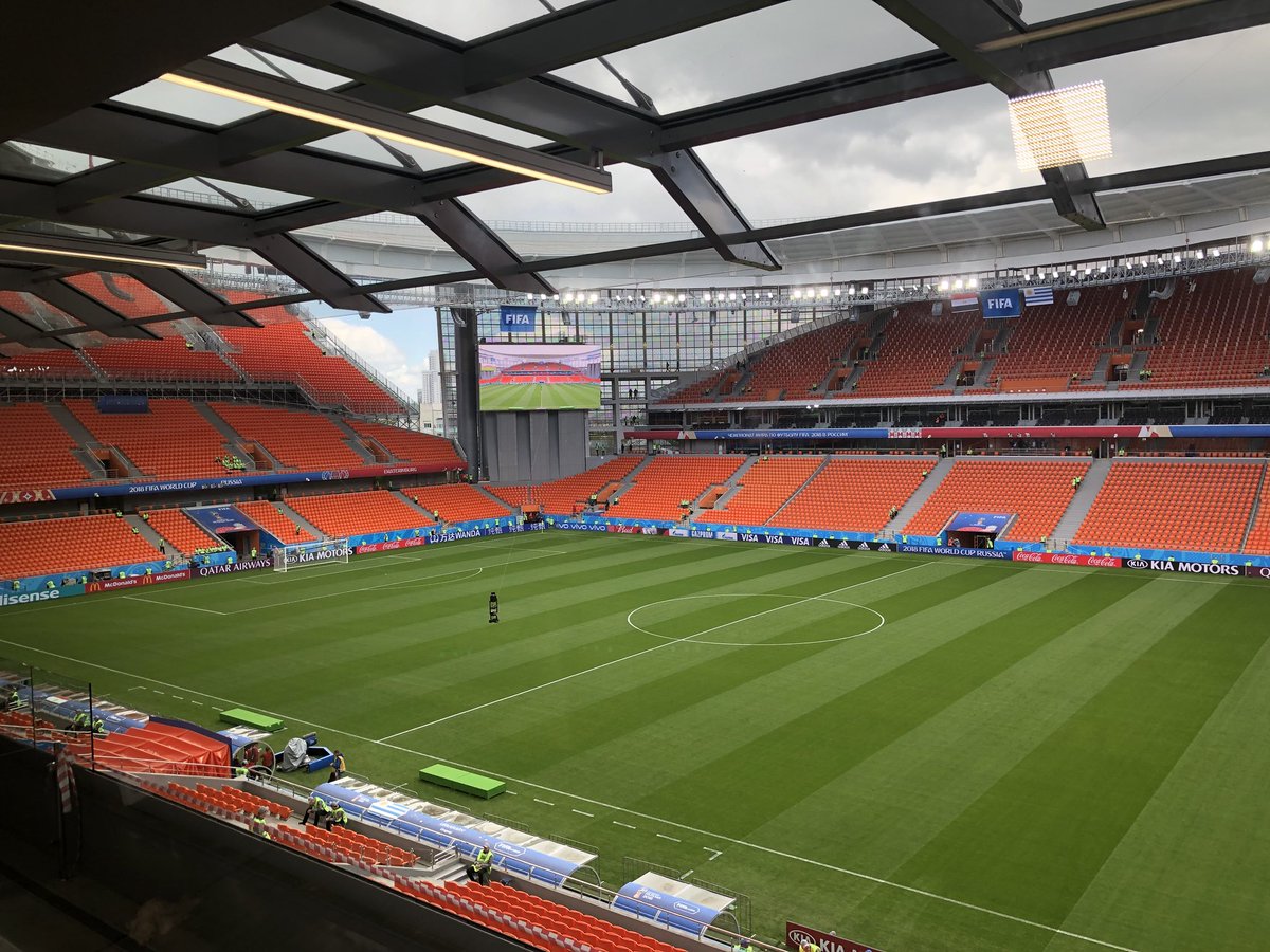تجري اللجنة المنظمة لكأس العالم تجربة لمراسم بداية مباراة مصر أمام أوروجواي المقرر إقامتها في الثالثة مساء بتوقيت مكة المكرمة على ملعب "إيكاترنبرج" ضمن الجولة الأولى للمجموعة الأولى من المونديال.