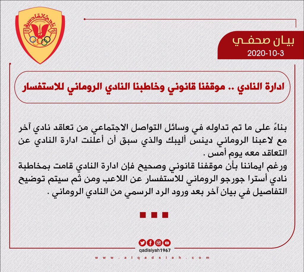 "بناءً على ما تم تداوله في وسائل التواصل الاجتماعي من تعاقد نادي آخر مع لاعبنا الروماني دينس أليبك والذي سبق أن أعلنت ادارة النادي عن التعاقد معه يوم أمس.
